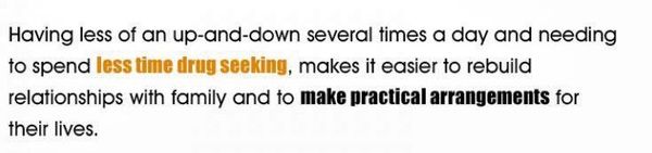 People are heroin dependent often spend most of their time trying to obtain and use heroin. This can involve criminal activity such as stealing. Patients in methadone do not need to do this. Instead, they can undertake productive activities such as education, employment and parenting.